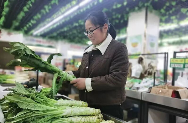 余青青代表在农贸超市整理家庭农场供应的蔬菜。(代表供图)